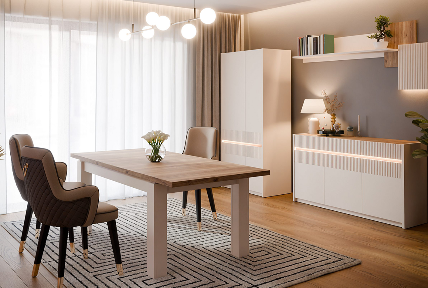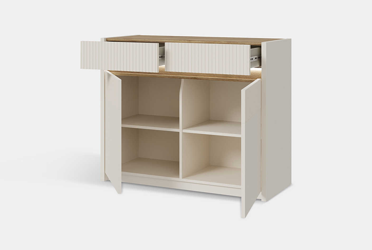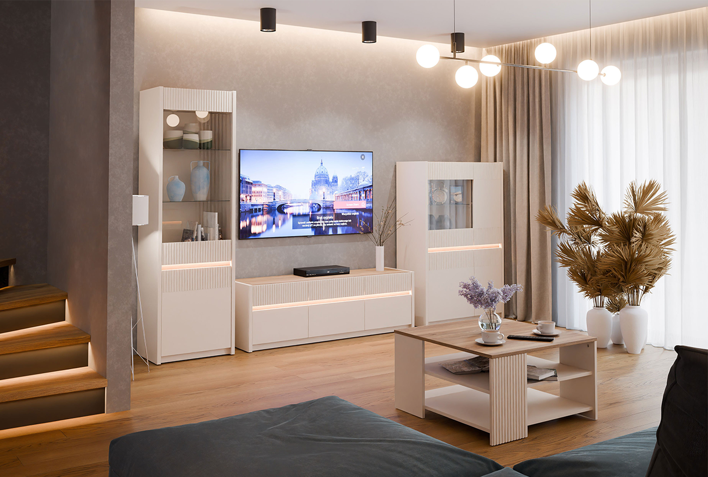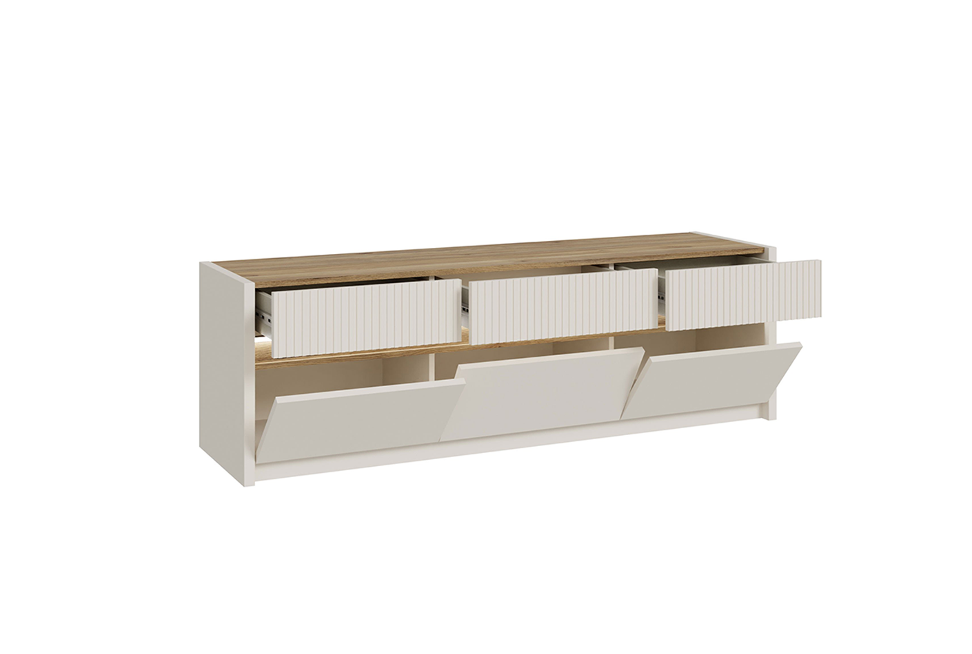 - Cena velja za tipski sestav, ki vsebuje: vitrino (OSQV811B), TV element (OSQT031B) ter vitrino (OSQV421B) v dekorju: peščena/hrast.