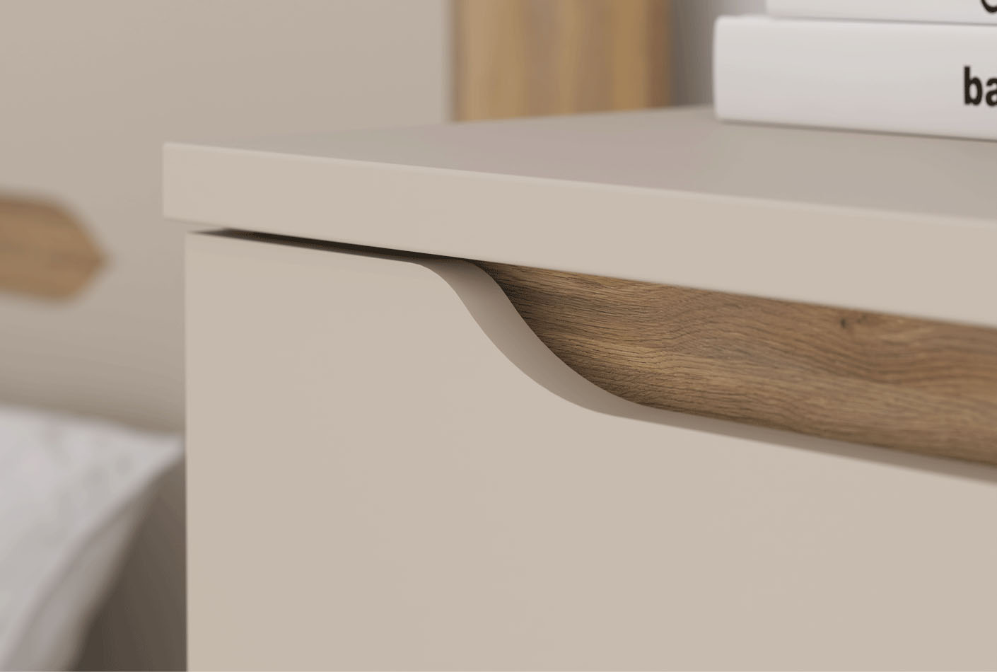 - Cena velja za sestav: postelja za ležišče 160/200, garderobno omara širine 177,5 cm, in dve nočni omarici.